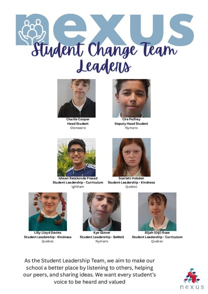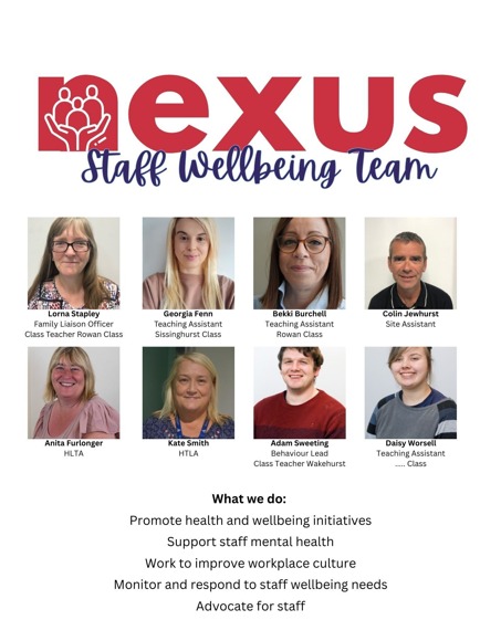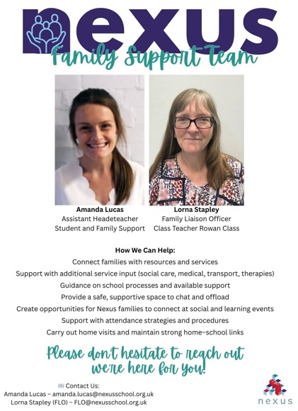 If you ever want to raise a concern about your child's mental health or have any questions, feel free to reach out to our Student and Family Support Lead – Amanda Lucas Assistant Headteacher: amanda.lucas@nexusschool.org.uk and/or Lorna Stapley Family Liaison Officer and Class Teacher: lorna.stapley@nexusschool.org.uk